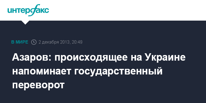 Киев. 2 декабря. INTERFAX.RU - Премьер-министр Украины Николай Азаров заявляет, что ситуация, сложившаяся вокруг акций протеста в Киеве имеет признаки государственного переворота.