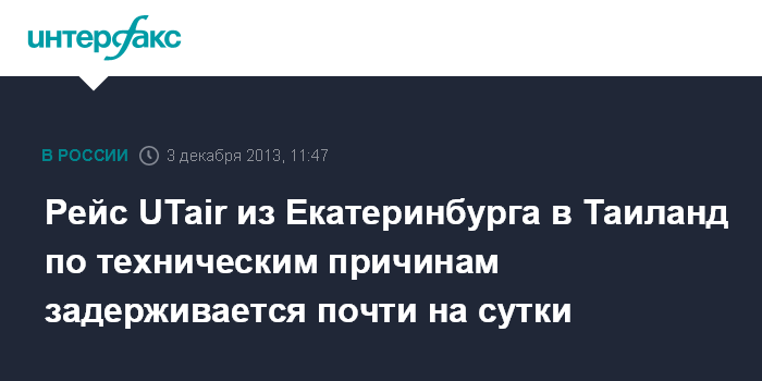 В пресс-службе авиакомпании "ЮТэйр" агентству уточнили, что выполнение рейса Екатеринбург-Краби на самолете Boeing 757-200, который должен был вылететь по расписанию в понедельник в 20:30 (18:30 мск) по местному времени, было отложено по технической причине.