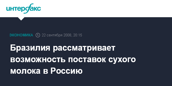 Москва. 22 сентября. INTERFAX.RU - Бразилия рассматривает возможность поставок сухого и сгущенного молока в Россию, сообщил журналистам в понедельник заместитель министра сельского хозяйства Бразилии Инасио Афонсо Кроец, возглавляющий бразильскую делегацию на Международной выставке-ярмарке продуктов питания.