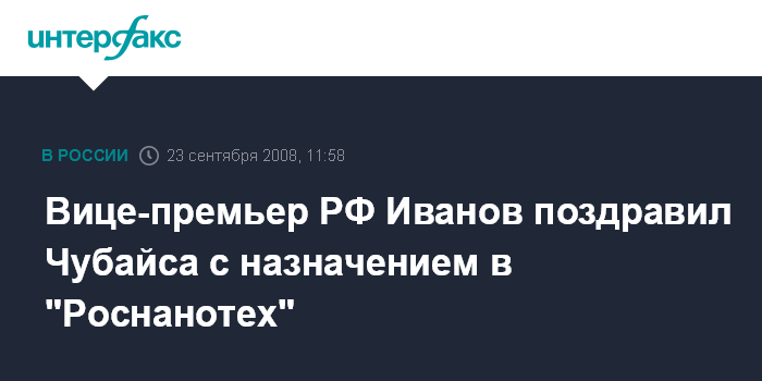 Вице-премьер РФ Иванов поздравил Чубайса с назначением в "Роснанотех"
