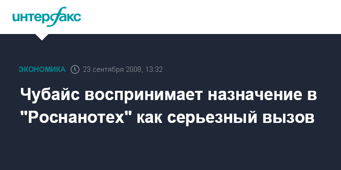 "Воспринимаю свое новое назначение как очень серьезный вызов, связанный с решением одной из наиболее масштабных задач в современной истории страны - перевод на инновационный путь развития", - заявил журналистам Чубайс во вторник после заседания правительственной комиссии по инновационному развитию.