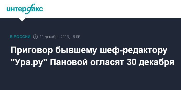 Екатеринбург. 11 декабря. INTERFAX.RU - Ленинский районный суд Екатеринбурга назначил дату оглашения приговора бывшему шеф-редактору информагентства "Ура.ру" Аксане Пановой, обвиняемой в вымогательстве и злоупотреблении полномочиями.