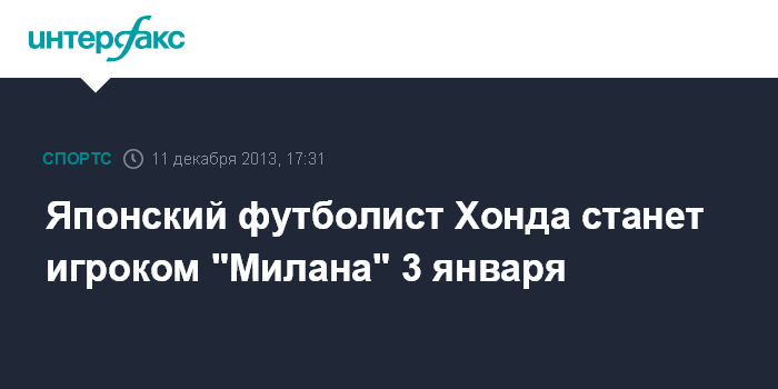 Милан. 11 декабря. INTERFAX.RU - Вице-президент итальянского футбольного клуба "Милан" Адриано Галлиани заявил, что полузащитник Кейсуке Хонда официально станет игроком этой команды 3 января следующего года.