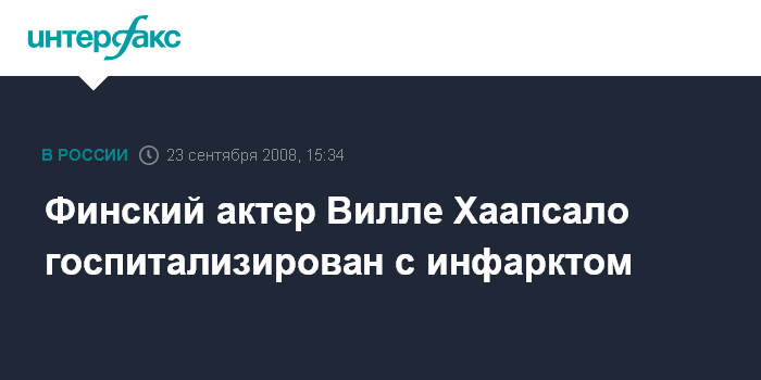 Москва. 23 сентября. INTERFAX.RU - Популярный в странах СНГ финский актер Вилле Хаапсало попал в США в больницу с инфарктом, сообщает Первый канал. Как отмечают медики, кризис уже миновал и жизнь актера вне опасности.