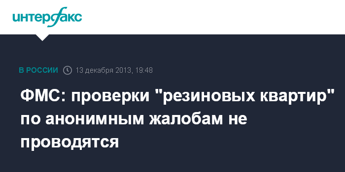 Москва.13 декабря. INTERFAX.RU - Правоохранительные органы не будут реагировать на анонимные жалобы от граждан на так называемые "резиновые квартиры", сообщила "Интерфаксу" первый заместитель руководителя ФМС России Екатерина Егорова.