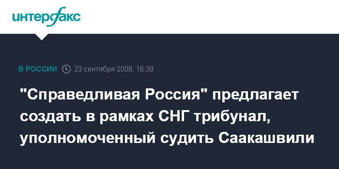 Москва. 23 сентября. INTERFAX.RU - Фракция "Справедливая Россия" предложила премьер-министру Владимиру Путину рассмотреть возможность учреждения в рамках СНГ трибунала, который осуждал бы и наказывал действия, подобные действиям лидера Грузии Михаила Саакашвили.