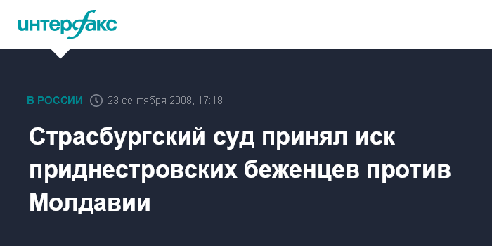 Кишинев. 23 сентября. INTERFAX.RU - Европейский суд по правам человека принял к рассмотрению первую из более чем 100 жалоб вынужденных переселенцев из Приднестровья против правительства Молдавии, утверждает председатель Движения приднестровских беженцев Анатолие Бызгу.