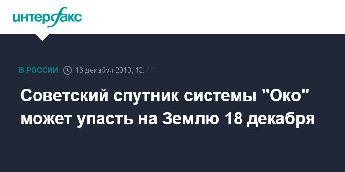 "Примерно 18 декабря, то есть послезавтра, упадет аппарат системы "Око". Он был запущен в СССР и предназначался для обнаружения стартов баллистических ракет. Этот спутник уже давно не работает и падает примерно с такой же орбиты, на которой работали спутники типа "Молния", - сказал собеседник агентства.