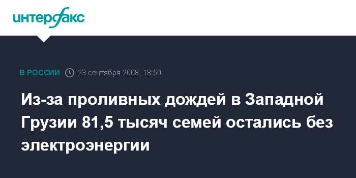 Москва. 23 сентября. INTERFAX.RU - В результате непрекращающихся в течение нескольких дней проливных дождей в Западной Грузии 81,5 тысяч семей лишены электроэнергии, сообщили "Интерфаксу" в компании Energo-Pro Georgia.