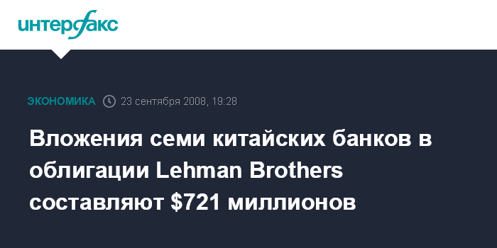 Москва. 23 сентября. NTERFAX.RU - Общая сумма вложений семи китайских банков в облигации обанкротившегося американского инвестиционного банка Lehman Brothers составляет $721 млн, сообщает издание "Чжунго чжэньцюань бао".