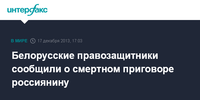 Москва. 17 декабря. INTERFAX.RU - Минской областной суд вынес смертный приговор 53-летнему гражданину России, сообщает сайт незарегистрированного в Белоруссии правозащитного центра "Весна".