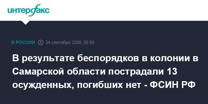 Самара. 23 сентября. ИНТЕРФАКС-ПОВОЛЖЬЕ - Тринадцать заключенных пострадали в ходе инцидента в одной из колоний в Самарской области, погибших нет, сообщили агентству "Интерфакс-Поволжье" в пресс-службе ГУ ФСИН по Самарской области.
