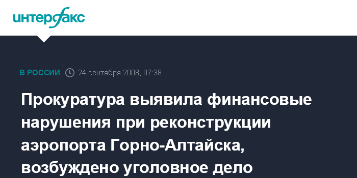Барнаул. 24 сентября. ИНТЕРФАКС-СИБИРЬ - Уголовное дело по факту хищения бюджетных средств, выделенных на реконструкцию аэропорта Горно- Алтайска, возбуждено по результатам проверки, проведенной Западно- Сибирской транспортной прокуратурой.