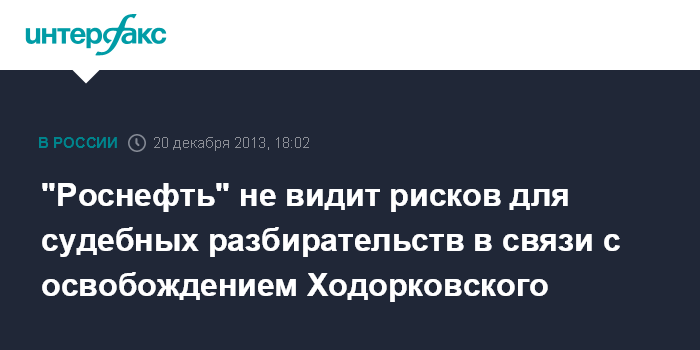 "Роснефть" не видит рисков для судебных разбирательств в связи с освобождением Ходорковского