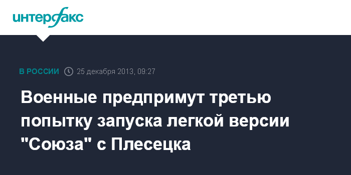 Москва. 25 декабря. INTERFAX.RU - Пуск легкой ракеты-носителя "Союз-2.1В" с космодрома Плесецк, ранее планировавшийся на 23 декабря, может состояться днем в среду, сообщил представитель управления пресс-службы и информации Минобороны РФ по Войскам воздушно-космической обороны полковник Дмитрий Зенин.