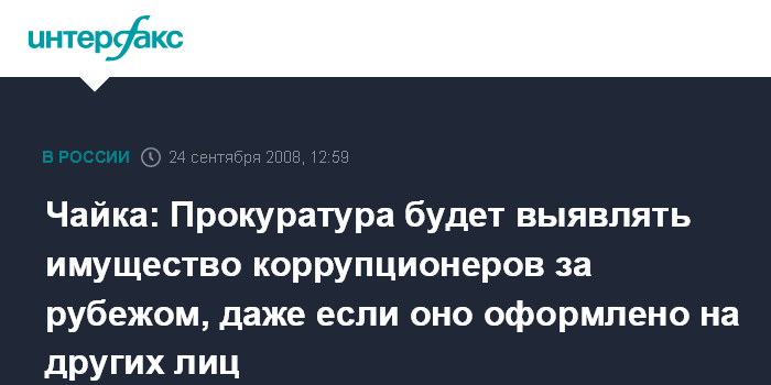 Москва. 24 сентября. INTERFAX.RU - Генпрокуратура примет меры по розыску за рубежом незаконно нажитого имущества коррупционеров, заявил в среду журналистам генпрокурор РФ Юрий Чайка.