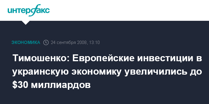 Москва. 24 сентября. INTERFAX.RU - Объемы прямых иностранных инвестиций со стран Европейского Союза в украинскую экономику по состоянию на 1 июля 2008 г. увеличились до $30 млрд, сообщила премьер-министр Украины Юлия Тимошенко на заседании правительства в среду.