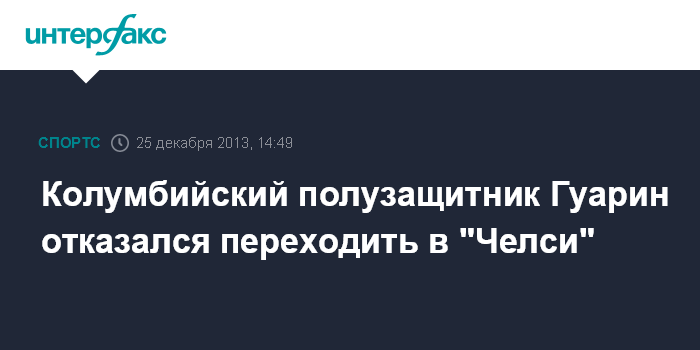Москва. 25 декабря. INTERFAX.RU - Центральный полузащитник "Интера" и сборной Колумбии по футболу 27-летний Фреди Гуарин отказался от перехода в "Челси", информирует Fichajes.