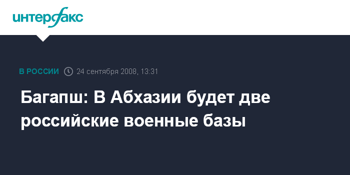 Москва. 24 сентября. INTERFAX.RU - На территории Абхазии российские военные будут дислоцированы на двух военных базах - сухопутной и морской, заявил президент республики Сергей Багапш.