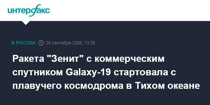 Москва. 24 сентября. INTERFAX.RU - С плавучей платформы "Одиссей" по программе "Морской старт" в среду произведен запуск российско-украинской ракеты "Зенит-3SL" с телекоммуникационным спутником Galaxy-19.
