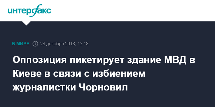 Москва. 26 декабря. INTERFAX.RU - Несколько сотен протестующих в четверг утром собрались у здания министерства внутренних дел Украины в Киеве с требованием объективного расследования избиения журналистки Татьяны Чорновил, а также в целом за отставку нынешнего правительства и, в частности, министра внутренних дел Виталия Захарченко.