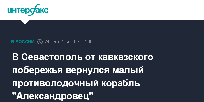 Москва. 24 сентября. INTERFAX.RU - Малый противолодочный корабль (МПК) "Александровец" вернулся в Севастополь после успешного выполнения задач у кавказского побережья, сообщили в среду "Интерфаксу-АВН" в службе информации и общественных связей Черноморского флота РФ.