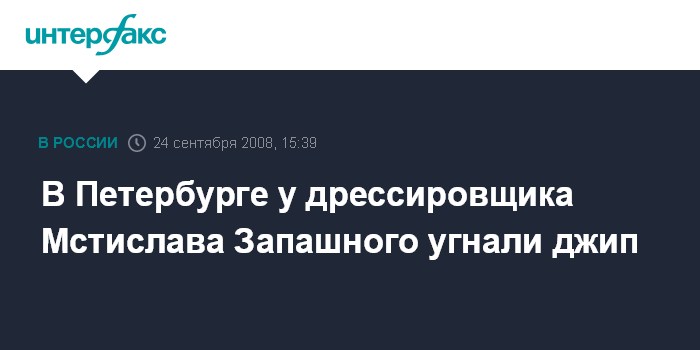 Москва. 24 сентября. INTERFAX.RU - У народного артиста России, известного дрессировщика Мстислава Запашного, приехавшего в Петербург на гастроли, угнали автомобиль, сообщил "Интерфаксу" в среду источник в правоохранительных органах.