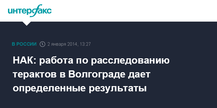 Москва. 2 января. INTERFAX.RU - Компетентные ведомства все эти дни продолжают всестороннюю работу по расследованию терактов, совершенных в Волгограде 29 и 30 декабря, сообщили в Национальном антитеррористическом комитете. Эта работа дает определенные результаты, подчеркнули в НАК.