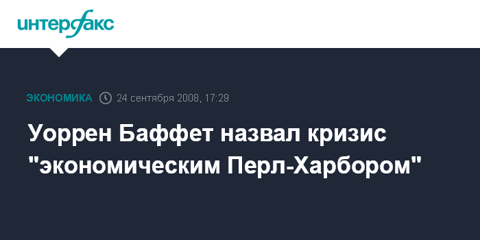 Нью-Йорк. 24 сентября. INTERFAX.RU - Миллиардер Уоррен Баффет назвал нынешний кризис "экономическим Перл-Харбором", сообщило агентство Bloomberg.