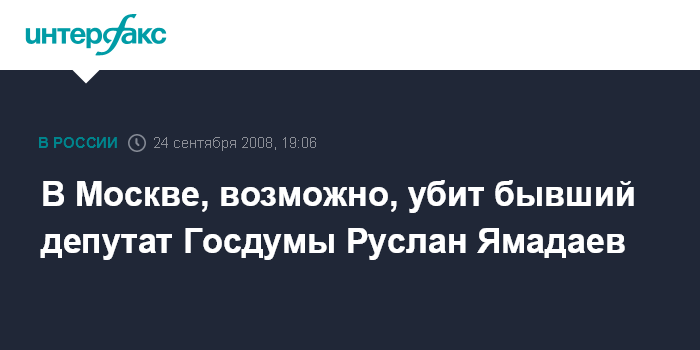 Москва. 24 сентября. INTERFAX.RU - В Москве убит экс-депутат Госдумы Руслан Ямадаев. Как сообщил "Интерфаксу" источник в правоохранительных органах, "в 18:30 возле дома № 10 по Смоленской набережной автомобиль Руслана Ямадаева был обстрелян неизвестными людьми из автоматического оружия".
