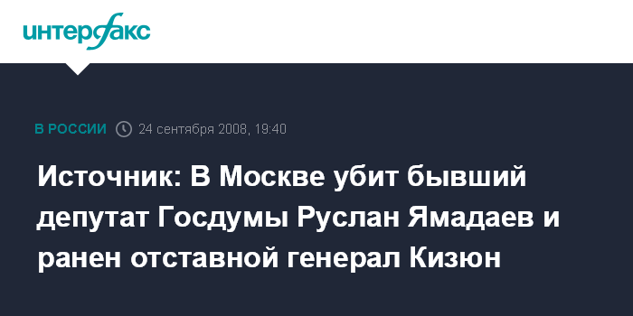 Москва. 24 сентября. INTERFAX.RU - В Москве убит экс-депутат Госдумы Руслан Ямадаев, сообщил "Интерфаксу" в среду вечером источник в правоохранительных органах.