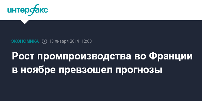 Производство в обрабатывающей промышленности Франции повысилось в ноябре на 0,3% относительно октября и на 1,6% по сравнению с ноябрем 2012 года. Изменение индикатора в помесячном выражении совпало с прогнозом экспертов, тогда как ожидалось, что рост в годовом выражении составит 1,5%.