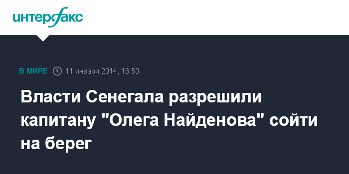 Москва. 11 января. INTERFAX.RU - Власти Сенегала разрешили капитану российского траулера "Олег Найденов" Вадиму Манторову сойти на берег. "Капитану вернули документы и разрешили покинуть судно, чтобы погулять по городу", - сообщили "Интерфаксу" в Росрыболовстве со ссылкой на представителя ведомства в Сенегале Александра Бирюкова.