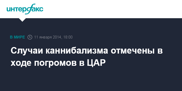 Москва. 11 января. INTERFAX.RU - Акты каннибализма имели место на севере столицы ЦАР Банги во время расправ, учиненных группами погромщиков над местными жителями, сообщили в субботу европейские СМИ.