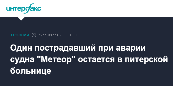 Санкт-Петербург. 25 сентября. INTERFAX.RU - В больнице Петербурга остается один пострадавший в результате аварии судна на подводных крыльях "Метеор", произошедшей в среду вечером в акватории Финского залива, сообщает пресс-служба Главного управления МЧС по городу.