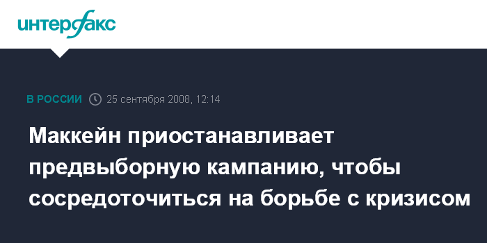 В интервью телеканалу CBS он сказал, что прекращает поездки по стране и встречи с избирателями, снимает с эфира платные рекламные ролики, не будет участвовать в мероприятиях по сбору средств в избирательный фонд и возвращается в Вашингтон, где будет помогать провести через Конгресс вызывающий споры план администрации Буша по выкупу за государственные деньги неликвидных банковских активов на сумму $700 миллиардов.
