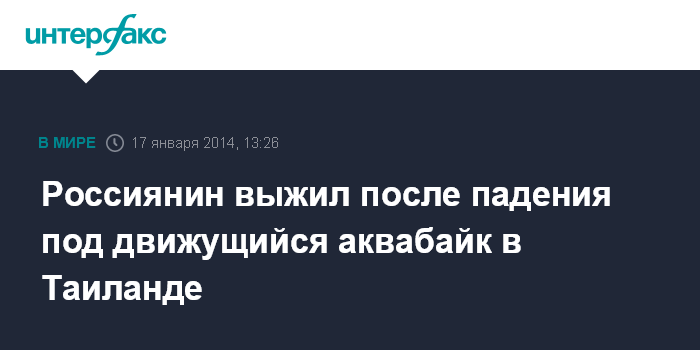 Москва. 17 января. INTERFAX.RU - Россиянин не смог подняться в воздух на водном парашюте и упал под движущийся аквабайк на Пхукете, сообщают "Новости Пхукета" в пятницу.