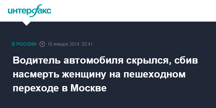 Москва. 18 января. INTERFAX.RU - Автомобиль насмерть сбил женщину на пешеходном переходе на юго-востоке Москвы и скрылся с места происшествия, сообщили "Интерфаксу" в пресс-службе управления ГИБДД по Москве в субботу.