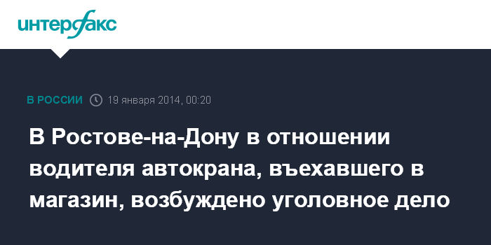 Москва. 19 января. INTERFAX.RU - В отношении водителя автокрана, который въехал в здание магазина в Ростове-на-Дону, возбуждено уголовное дело, сообщили в воскресенье агентству "Интерфакс-Юг" в пресс-службе ГУ МВД РФ по Ростовской области.
