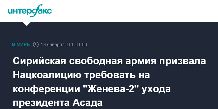 "Мы просим братьев, которые поедут на женевские переговоры, следовать идеям революции - Башар Асад и его приспешники должны уйти, и необходимо сделать так, чтобы он никогда больше не правил Сирией", - заявил в субботу официальный представитель ССА, которого цитирует телеканал "Аль-Джазира".
