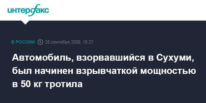 Москва. 25 сентября. INTERFAX.RU - По оценке специалистов, мощность взрывного устройства, сработавшего в автомашине у здания Службы госбезопасности Абхазии в четверг утром, была эквивалентна 50 кг тротила.