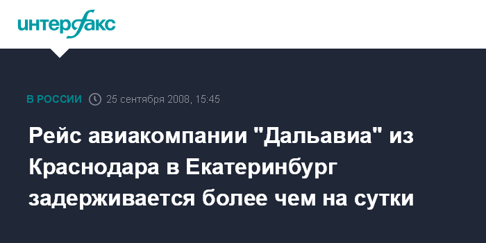 Москва. 25 сентября. INTERFAX.RU - Рейс авиакомпании "Дальавиа" N358 из Краснодара в Екатеринбург задерживается более чем на сутки по техническим причинам.