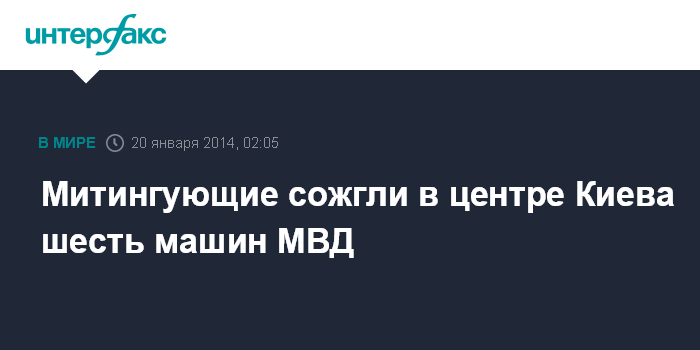 Москва. 20 января. INTERFAX.RU - Участники митингов в центре Киева сожгли вечером в воскресенье 6 транспортных средств, сообщает управление по связям с общественностью МВД Украины.