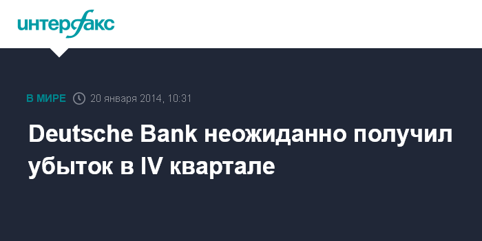 Москва. 20 января. INTERFAX.RU - Deutsche Bank AG, крупнейший коммерческий банк Германии, в воскресенье объявил о доналоговом убытке за четвертый квартал 2013 года в связи с переоценкой активов, судебными разбирательствами и снижением доходов от инвестиционно-банковской деятельности.