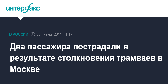 Москва. 20 января. INTERFAX.RU - Два трамвая столкнулись на северо-западе столицы, пострадали двое пассажиров, сообщил "Интерфаксу" источник в правоохранительных органах.