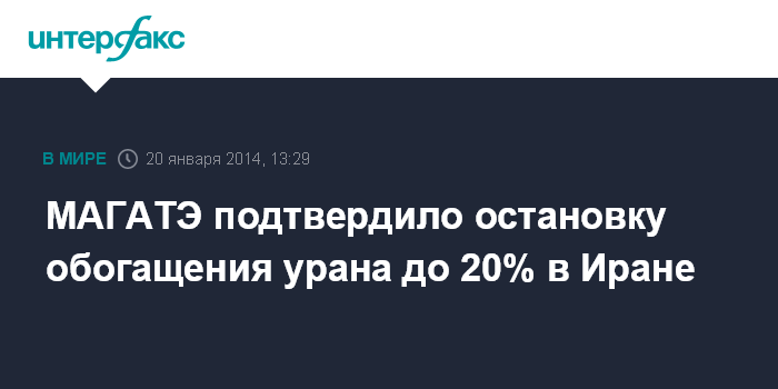 Москва. 20 января. INTERFAX.RU - Международное агентство по атомной энергии (МАГАТЭ) подтвердило, что Иран в понедельник прекратил обогащение урана до уровня 20% в рамках выполнения первой части промежуточного соглашения между шестеркой международных посредников и Тегераном.