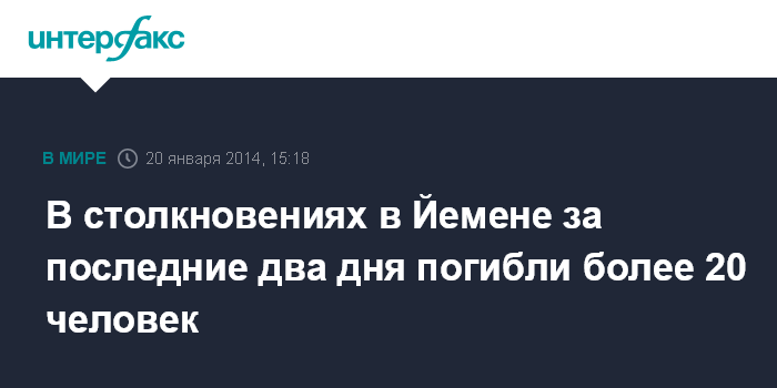 Москва. 20 января. INTERFAX.RU - По меньшей мере 22 человека погибли за последние два дня на севере Йемена в результате столкновений между повстанцами из движения хути и представителями клана хашидитов, сообщает в понедельник ливанская газета Daily Star.