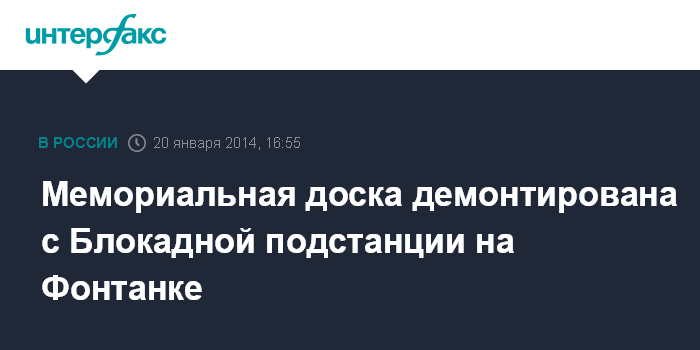 Москва. 20 января. INTERFAX.RU - Члены комиссии по образованию, культуре и науке законодательного собрания Петербурга просят губернатора Георгия Полтавченко защитить Блокадную подстанцию на Фонтанке, с которой исчезла мемориальная доска.