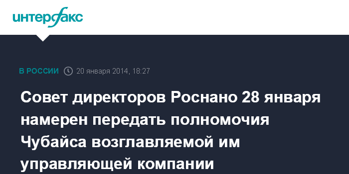 Совет директоров Роснано 28 января намерен передать полномочия Чубайса возглавляемой им управляющей компании