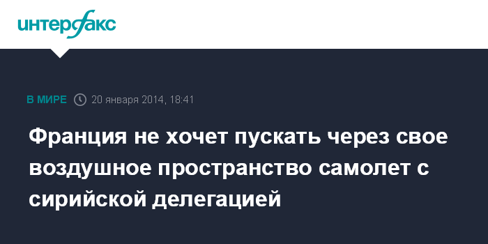 Париж. 20 января. INTERFAX.RU - Власти Франции не хотят пропускать через свое воздушное пространство самолет, на котором делегация сирийских властей во вторник собирается прилететь на конференцию "Женева-2", сообщает на своем веб-сайте французский журнал Le Point.
